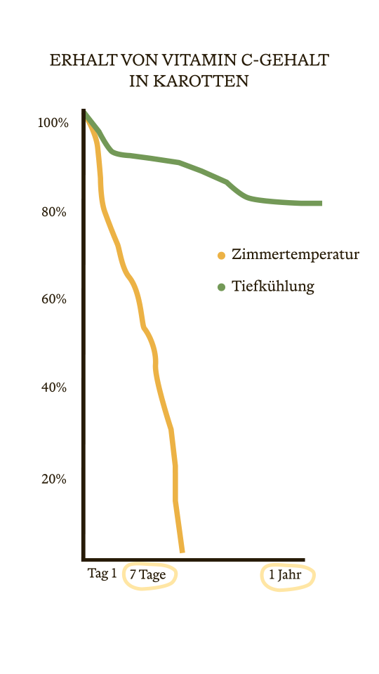 Tiefgefrorenes Gemüse (und Obst) hat oft den Ruf, Essen zweiter Klasse zu sein. Aber wusstest Du, dass gefrorenes Gemüse im Durchschnitt deutlich nährstoffreicher ist als „frisches“ Gemüse aus dem Supermarkt? Denn bevor Du dieses im Laden kaufst, hat es bereits mehrere Tage – oft sogar mehrere Wochen – Transport und Lagerung hinter sich und verliert dabei einen erheblichen Anteil seiner natürlichen Nährstoffe: Karotten enthalten beispielsweise eine Woche nach der Ernte nur noch circa 20 Prozent ihres Vitamin C-Gehalts. Karotten, die nach der Ernte direkt schockgefroren wurden, schneiden da deutlich besser ab.